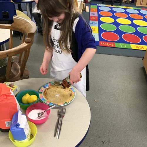 Fry class worked together to make pancakes for pancake day last week. They had fun choosing their own toppings.